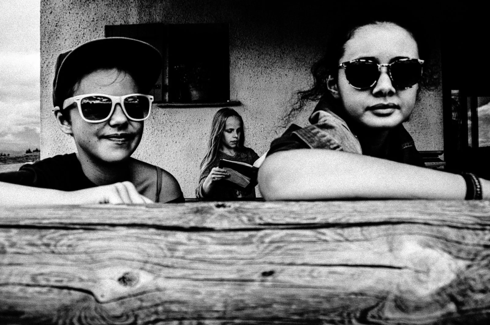 The choice of black-and-white is not aesthetic preference. It is method. As philosopher Claude Molzino has written, black-and-white disincarnates: it distances, it abstracts, it reveals what colour, with its seductive immediacy, would conceal. Colour says look where I am turned. Black-and-white says look at me — at the image as thought, as construction, as act of reading. It is the condition under which photography becomes writing — graphie — and the condition under which a philosopher could enter into dialogue with these images.